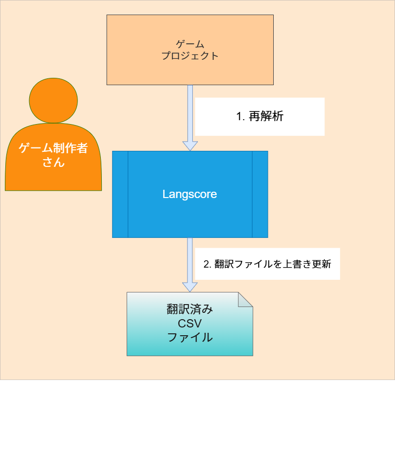 ゲーム制作者の方はLangscoreを使用して、ゲームからテキストの抽出・翻訳CSVの作成を行います。 翻訳者の方には作成したCSVを渡してください。